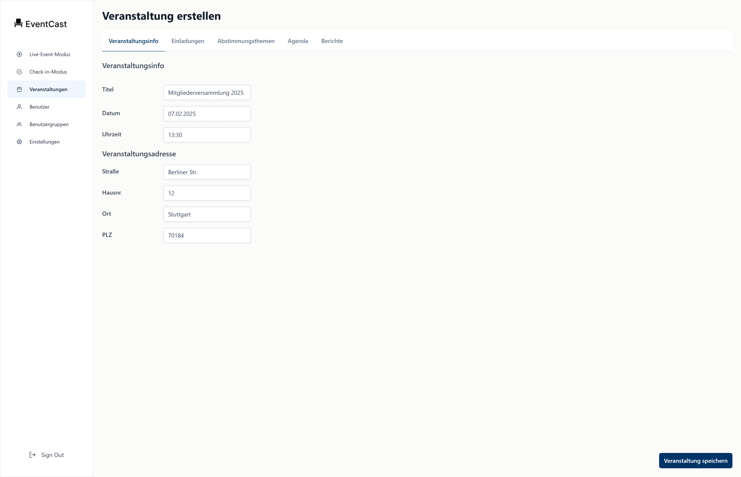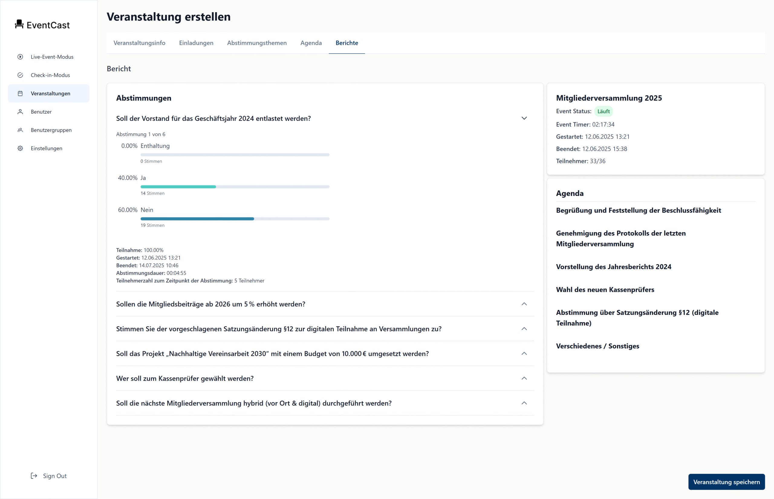 EventCast ist eine webbasierte Plattform, die ich entwickelt habe, um Live-Versammlungen mit Abstimmungen für Genossenschaften und andere mitgliederbasierte Organisationen zu vereinfachen.