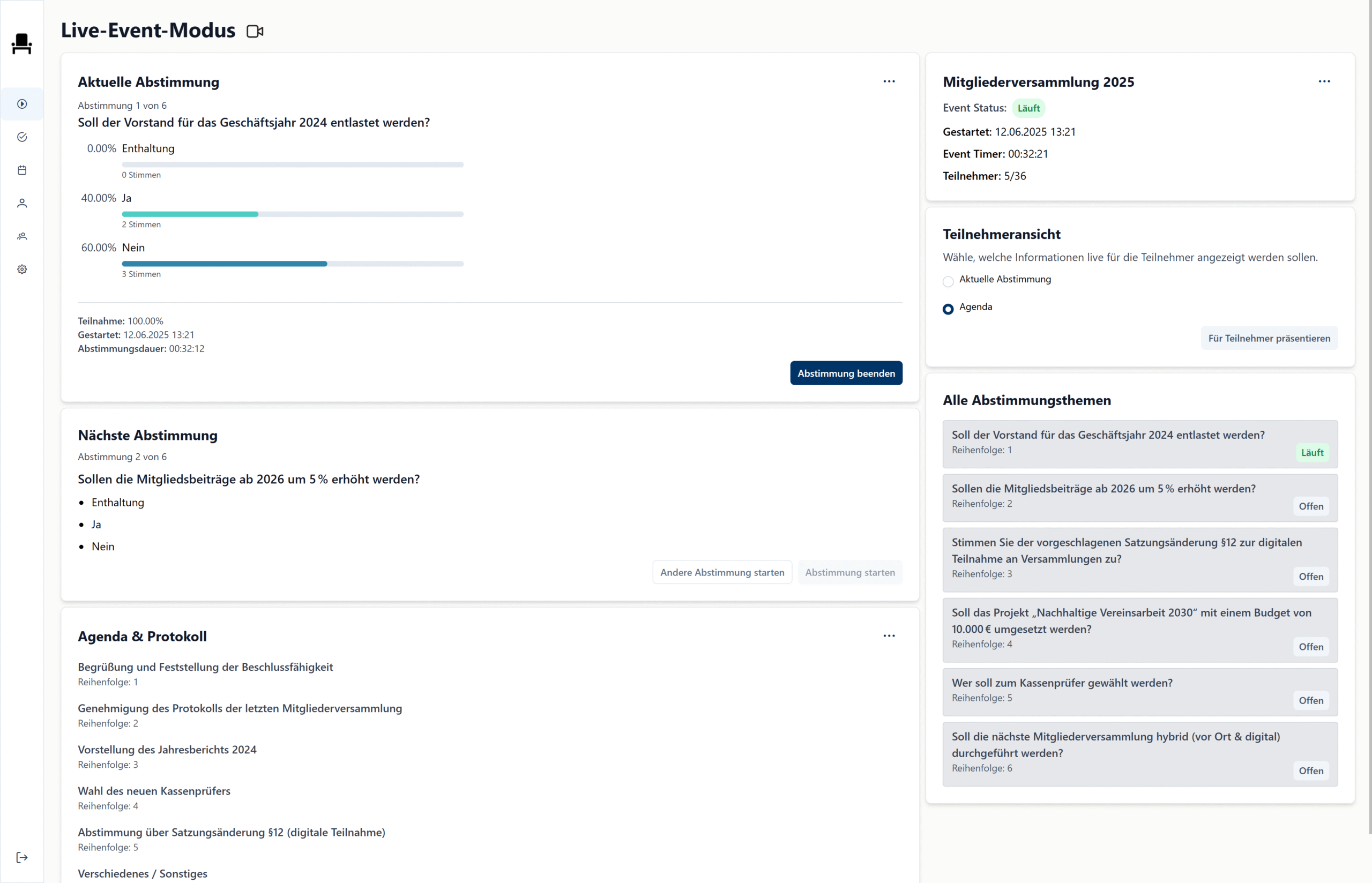 Sie ermöglicht eine schnelle Teilnehmer-Onboarding, sicheres digitales Abstimmen und eine rechtssichere sowie intuitive Ergebnisdarstellung in Echtzeit.